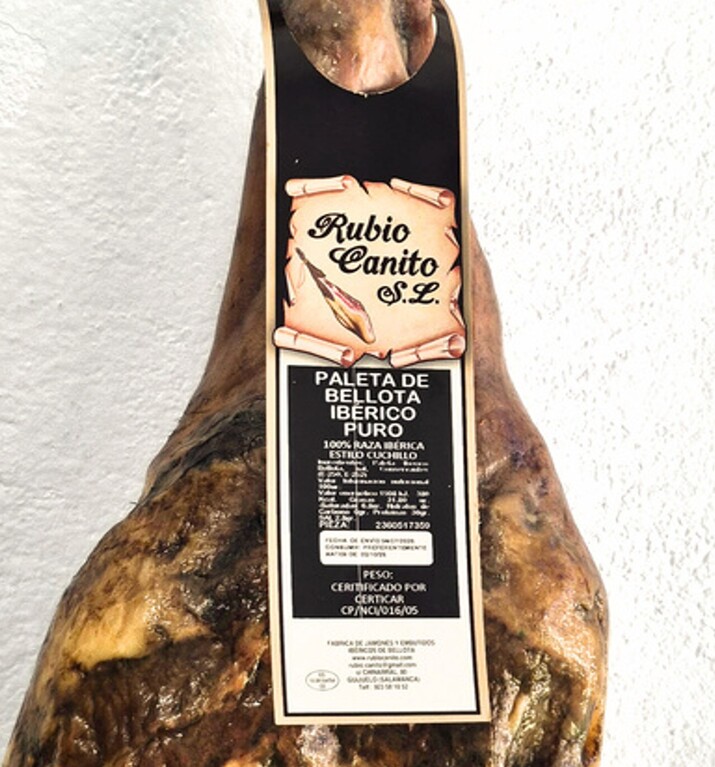 Paleta de bellota ibérica 100% Rubio Canito, curada 24 meses en nuestros secaderos naturales de Guijuelo. Origen: cerdos 100% ibéricos criados en libertad y alimentados con bellota durante la época de montanera. Sabor ibérico profundo, carne jugosa y carácter único. Envío gratuito desde nuestra fábrica.